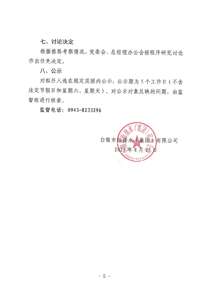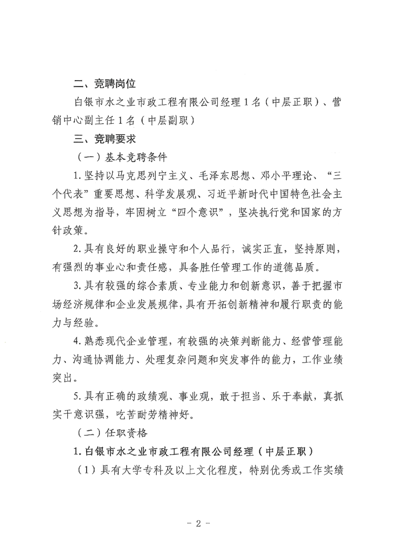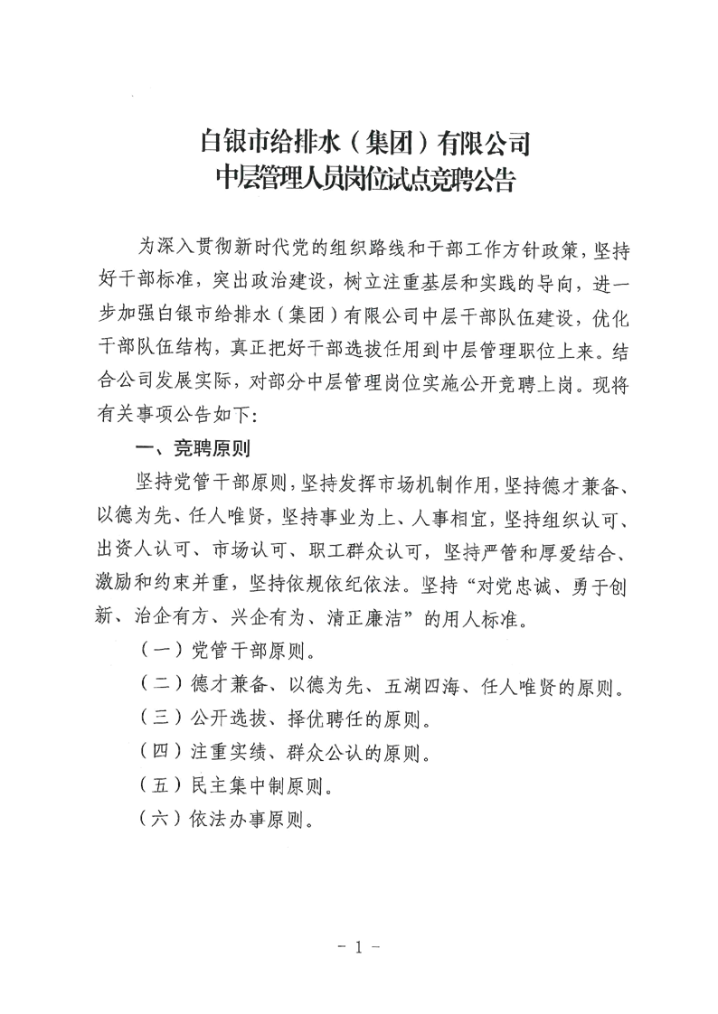 白銀市給排水(集團(tuán))有限公司 中層管理人員崗位試點(diǎn)競(jìng)聘公告